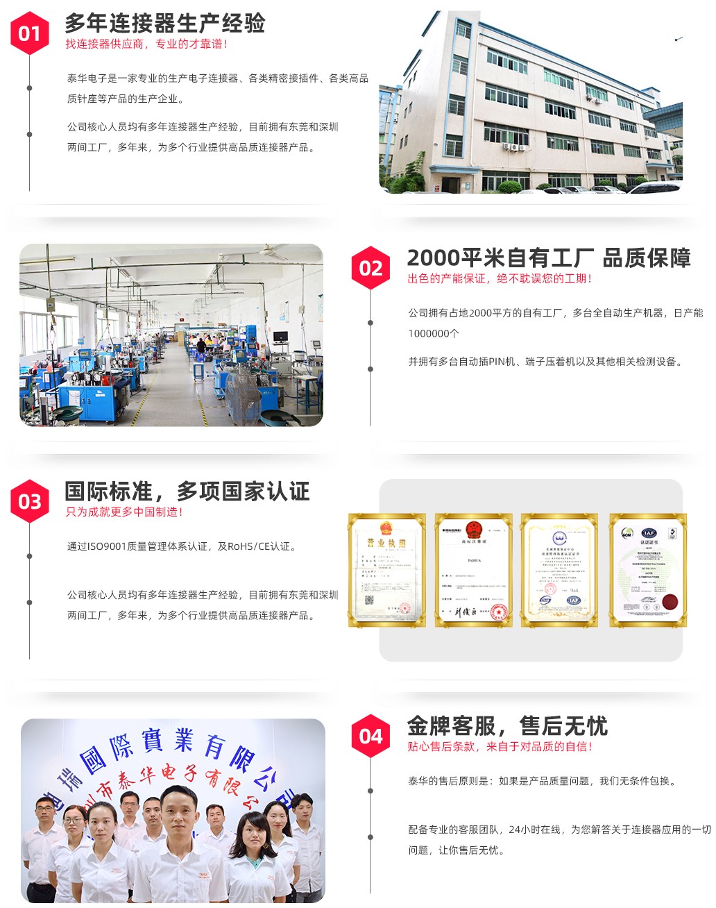 深圳市泰華電子有限公司15年專注連接器,多來成功為全國2000家大中小型企業(yè)提供專業(yè)的技術(shù)和服務(wù)。本公司具備先進的生產(chǎn)設(shè)備,標(biāo)準(zhǔn)化生產(chǎn)流程接插件日產(chǎn)100萬。所有產(chǎn)品通過ISO9001、ROHS等認(rèn)證,自成立以來一直秉承品質(zhì)為先,客戶至上的理念。